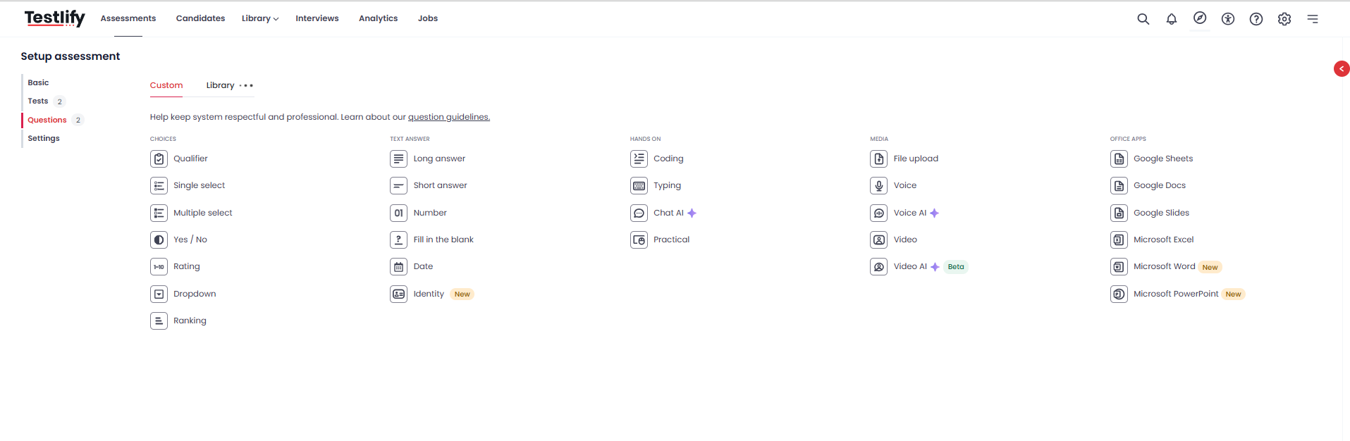 For a detailed understanding of the types of custom questions you are incorporate in the assessment, please refer to this help article.