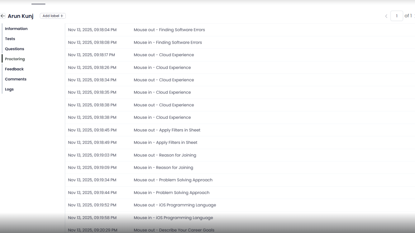 Access Detailed Logs- You will be redirected to the logs page, where you can review the exact times and activities associated with mouse-out events during the assessment.