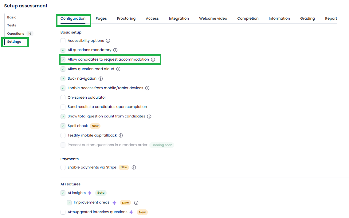 Note: The option to request accommodations is disabled by default but can be turned on under the 'Configuration' tab in Assessment Settings during the assessment creation process.