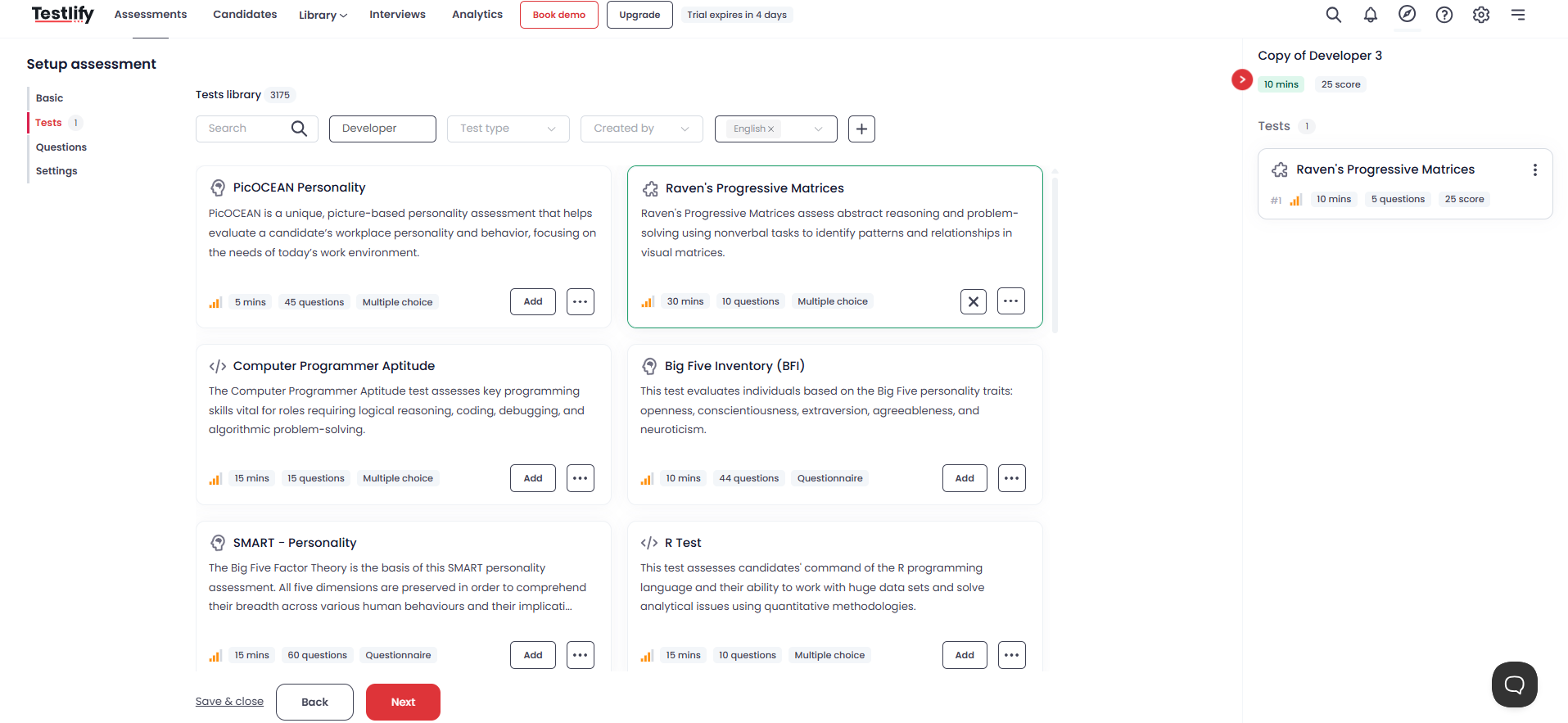 Move on to the next tab 'Tests', and add relevant tests to your assessment by using the filters provided.