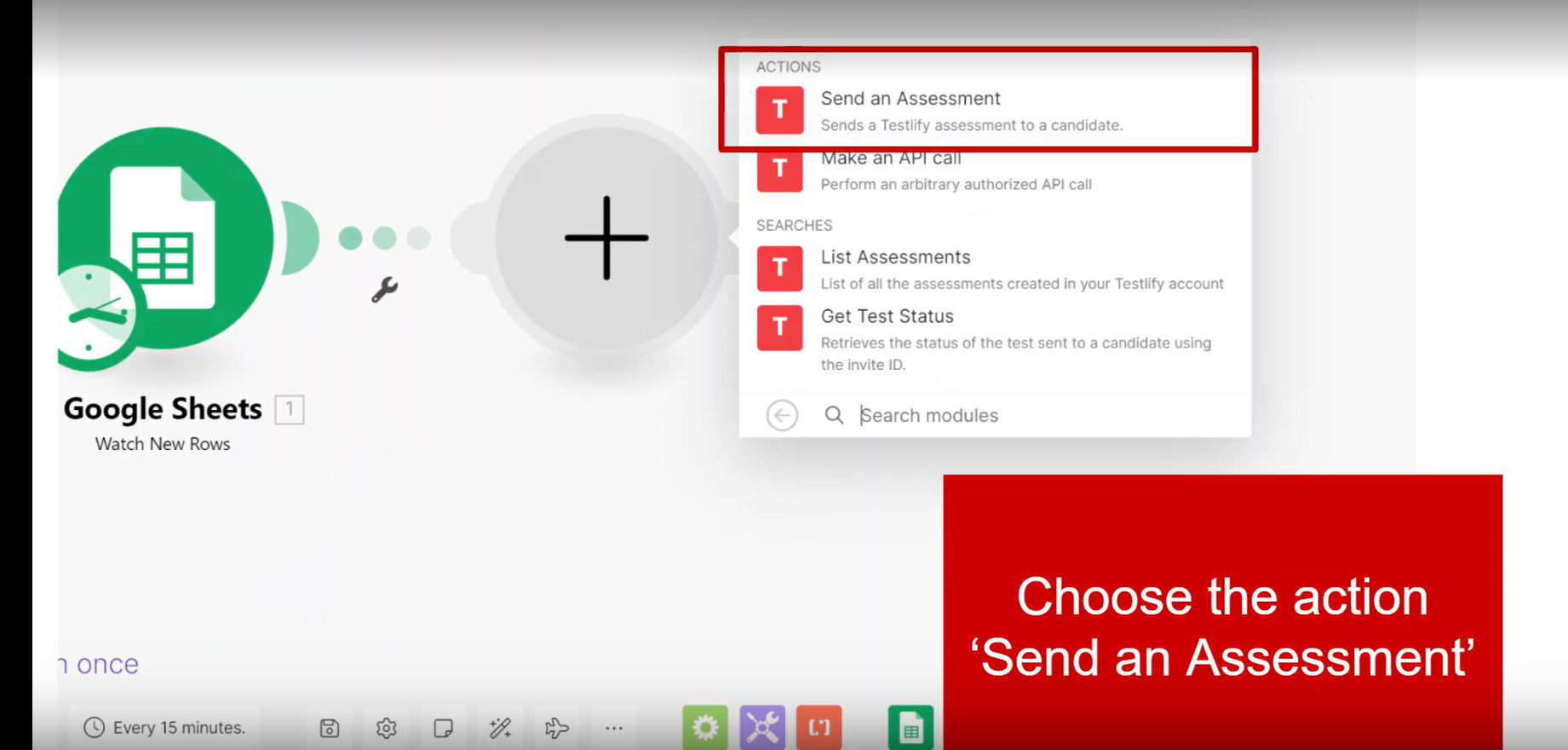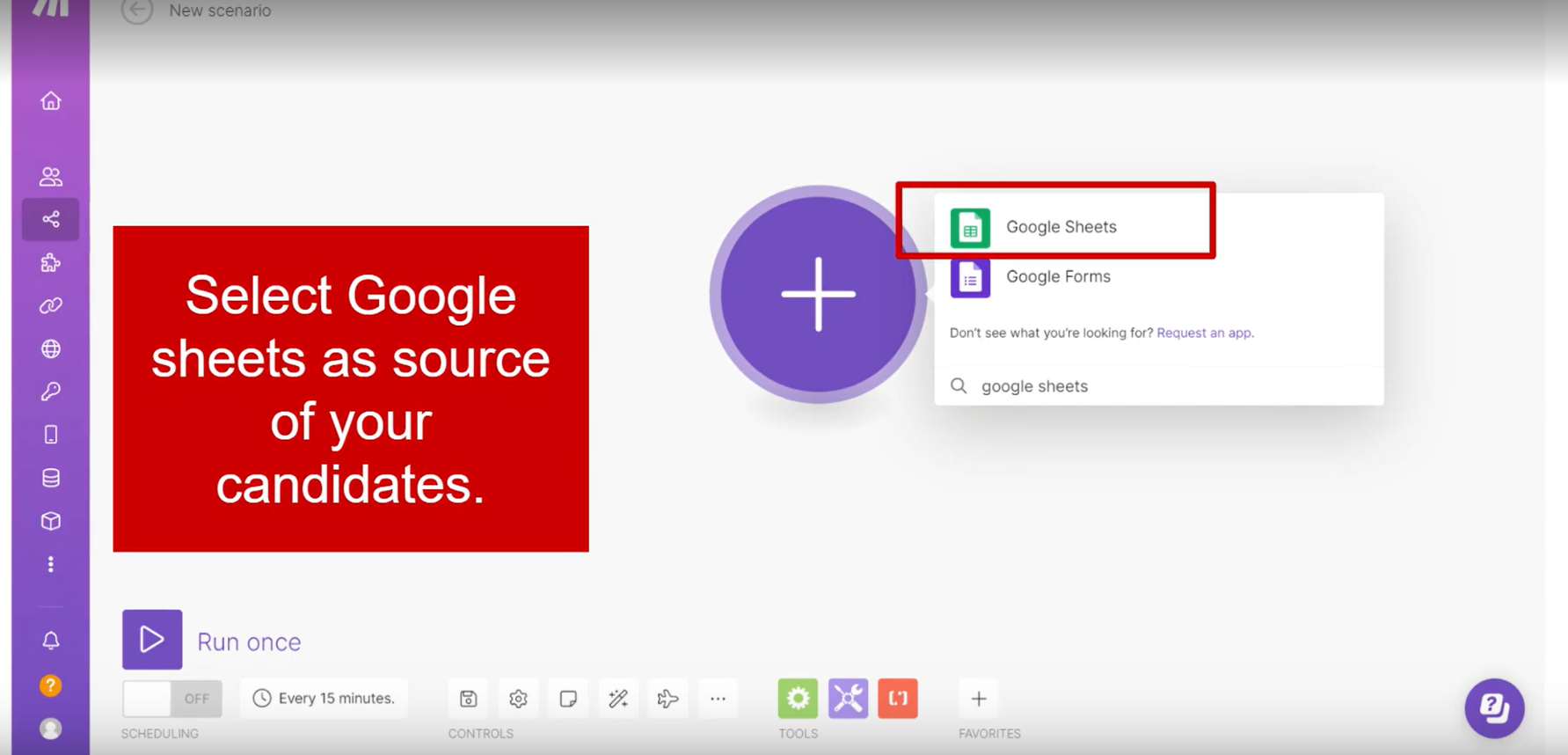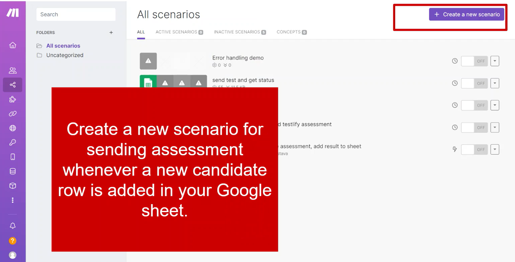 - Click on “Create a new scenario” for sending assessments whenever a new candidate row is added to your Google Sheet.