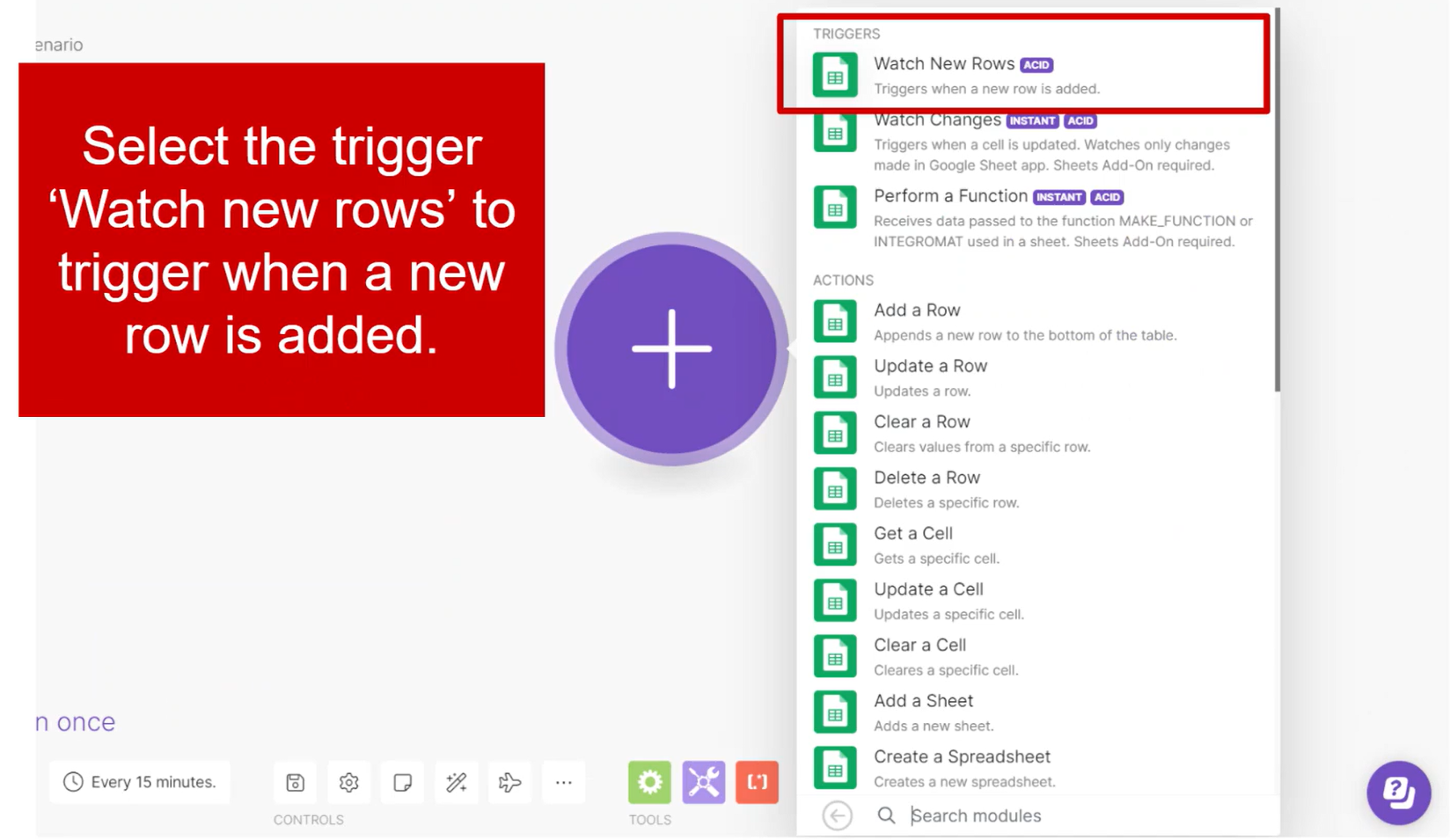 - Choose the "Watch New Rows" trigger to activate the process when a new row is appended.