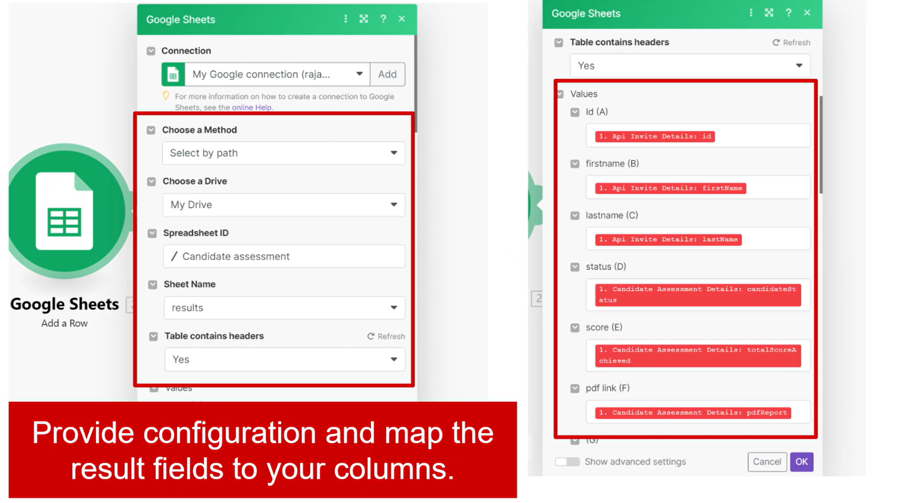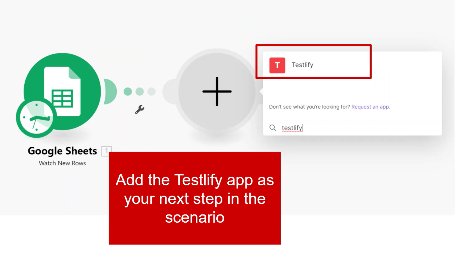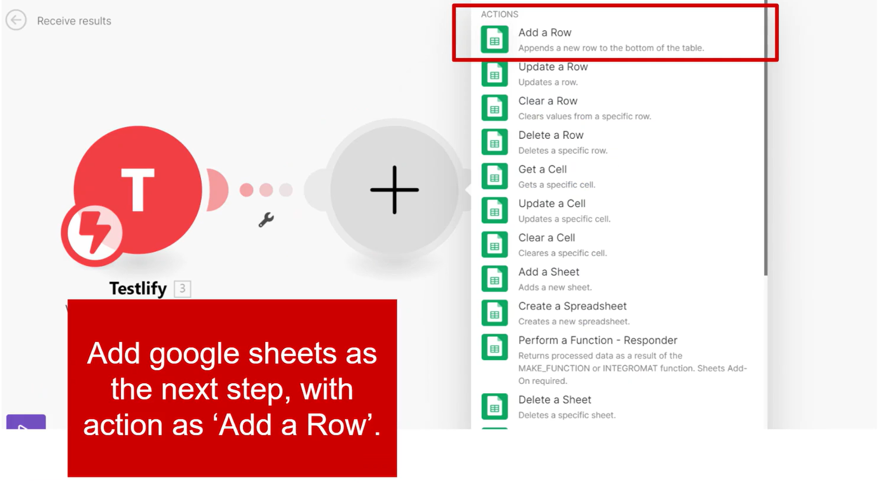 - Next, add Google Sheets as the following step, choosing the action "Add a Row."