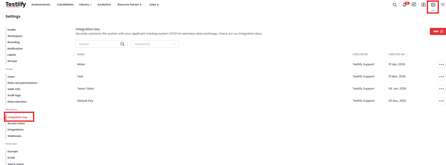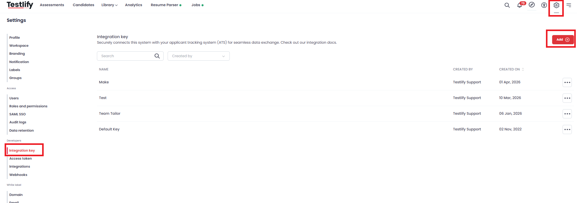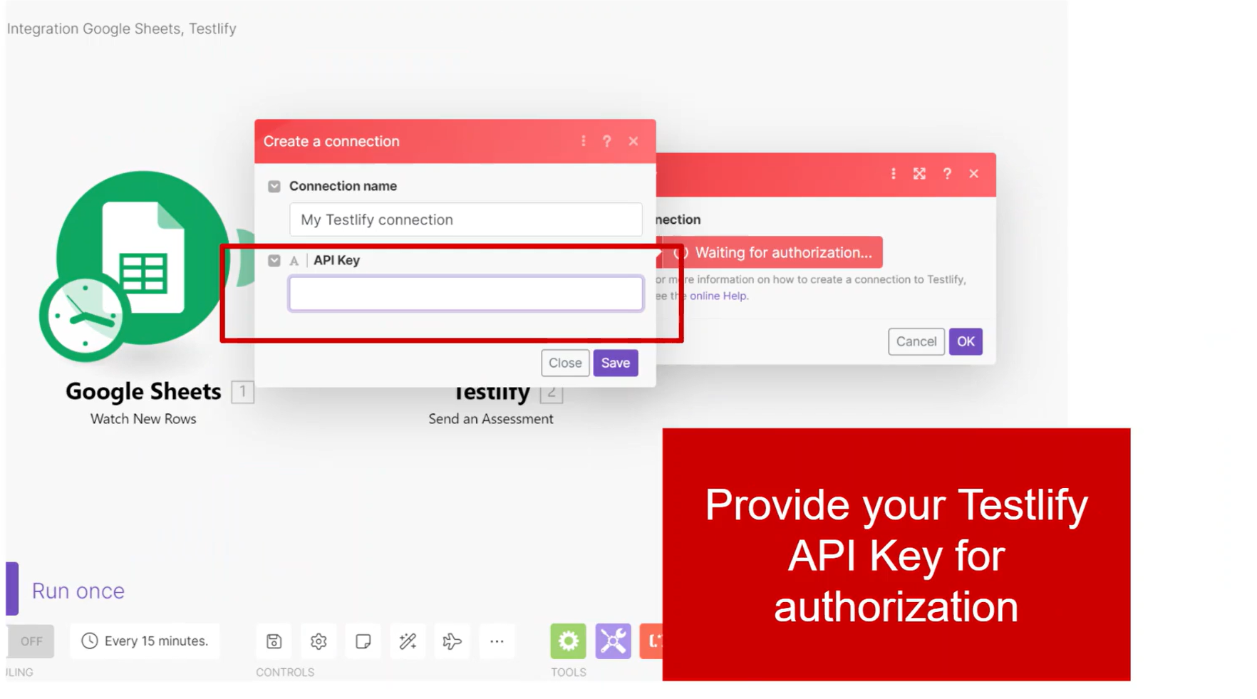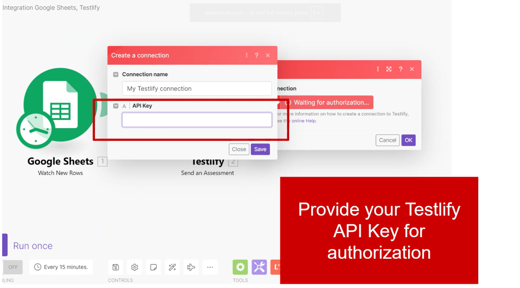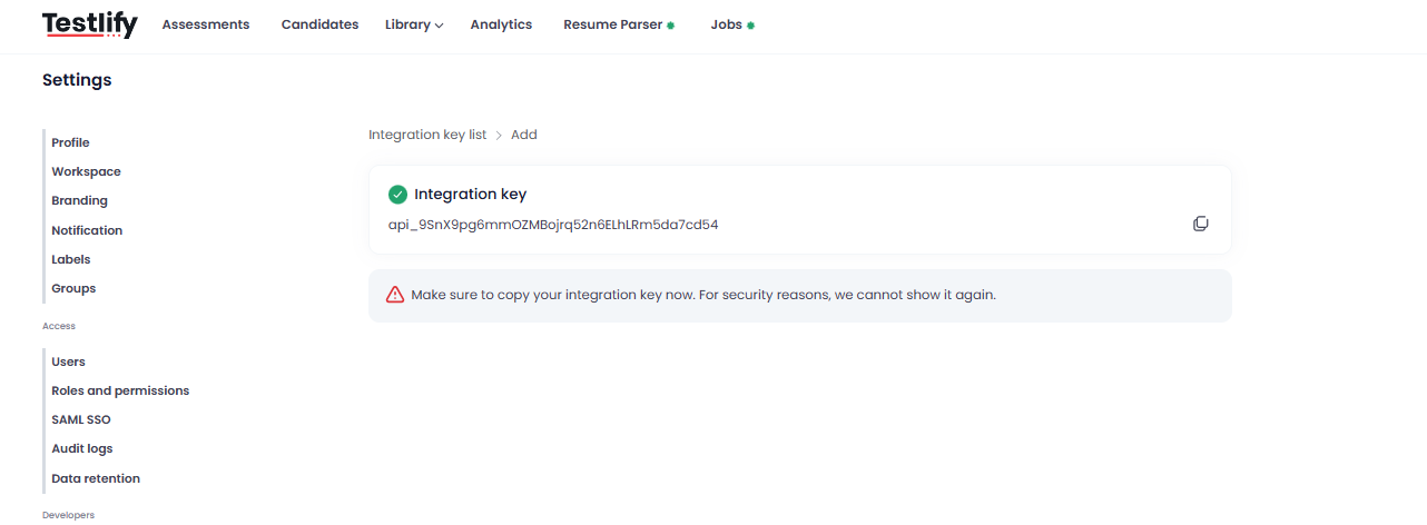 - You are required to paste the Testlify API Key that has been generated for authorization.