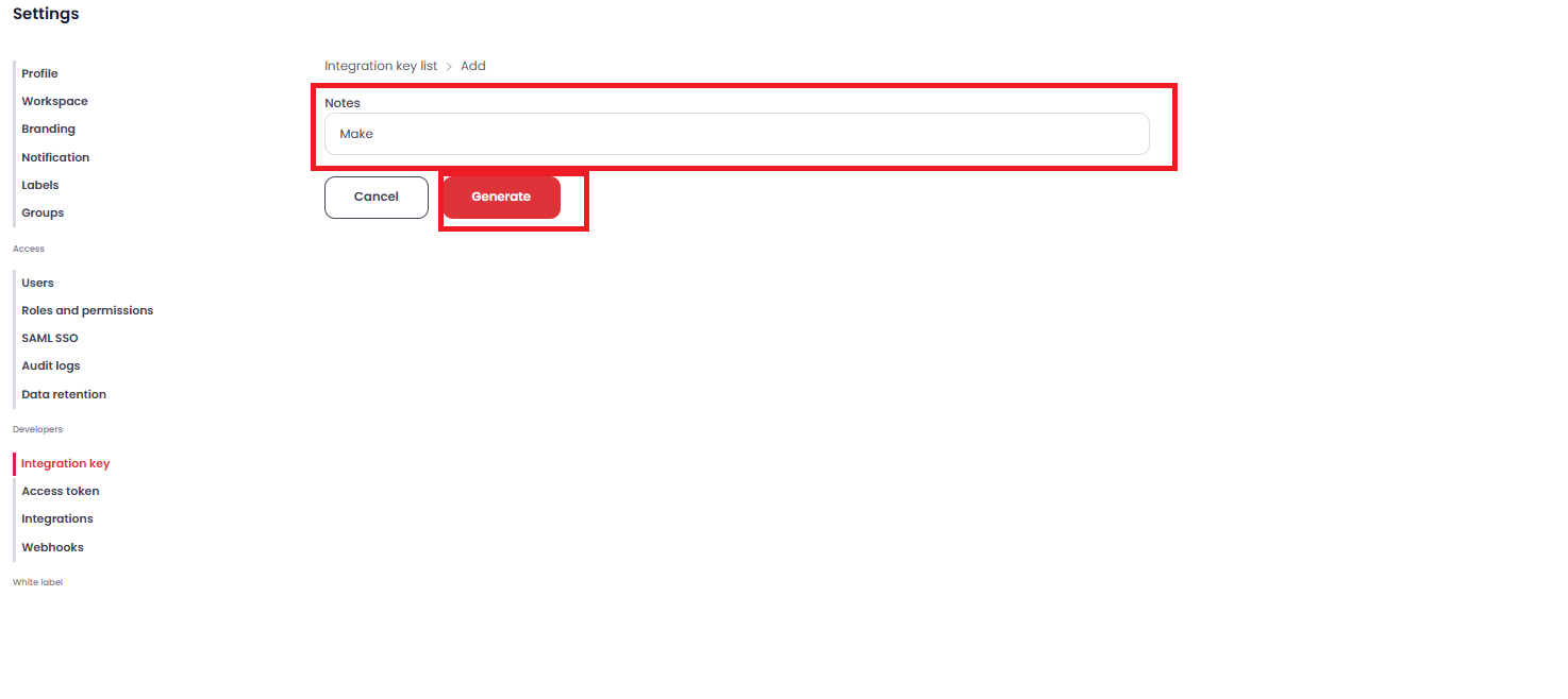 - Select "Integration Key" and then proceed to click on Add and "Generate Key."