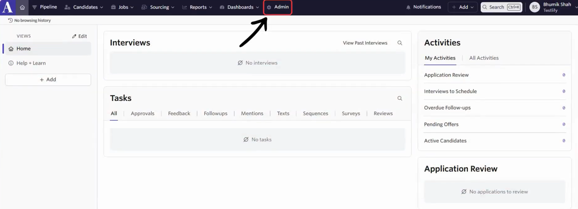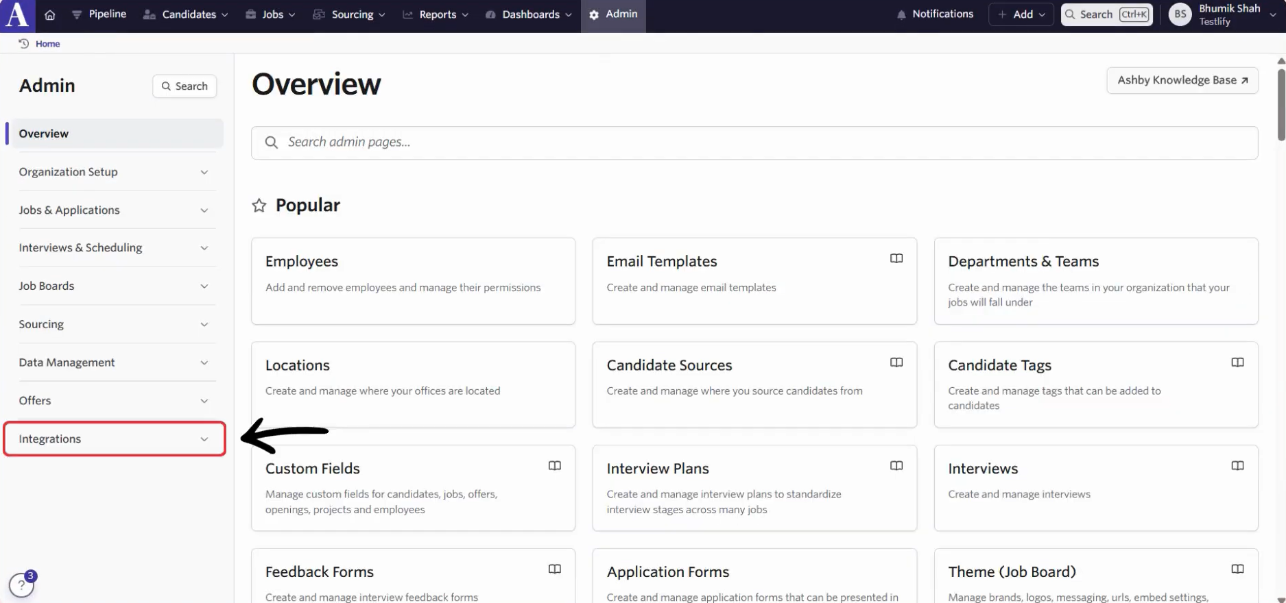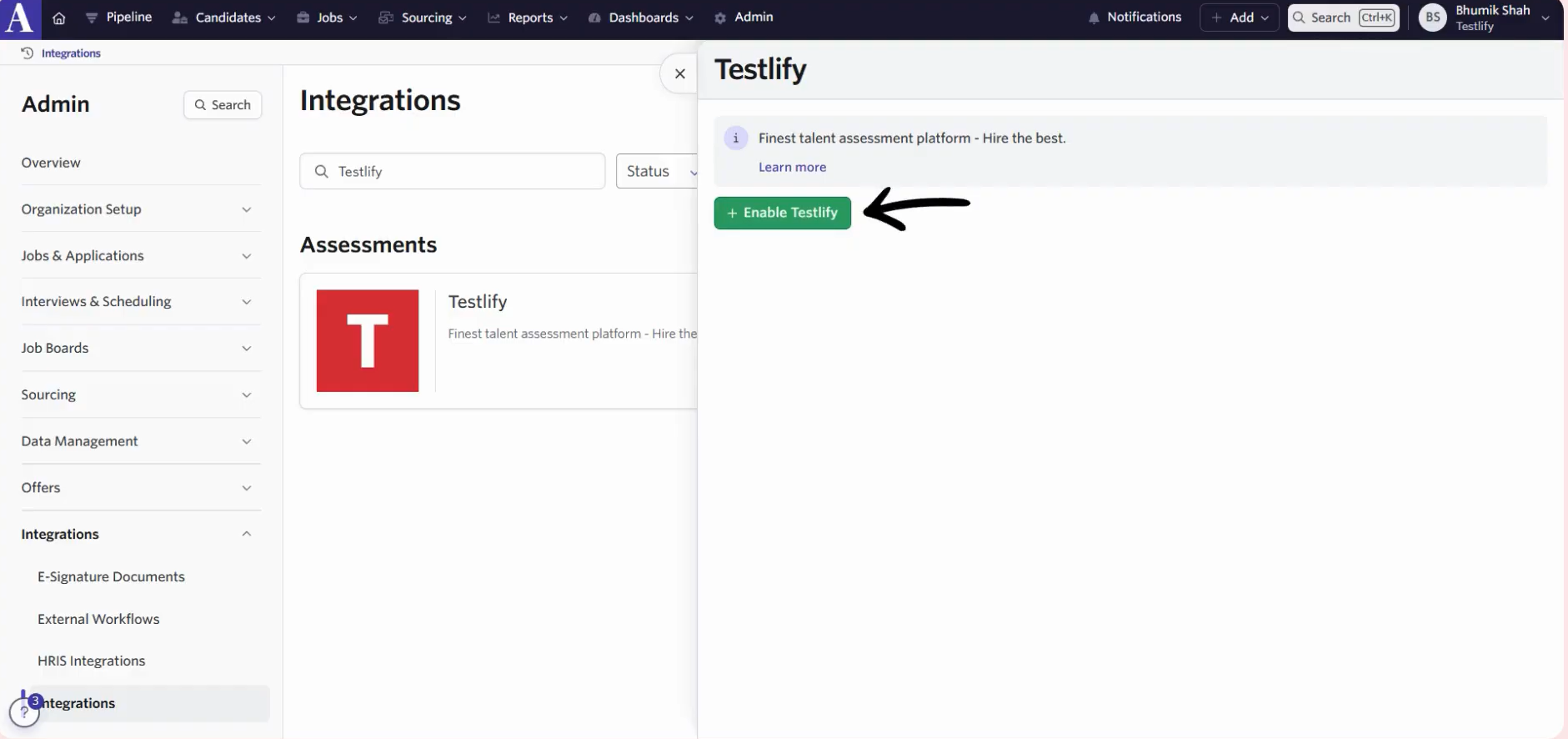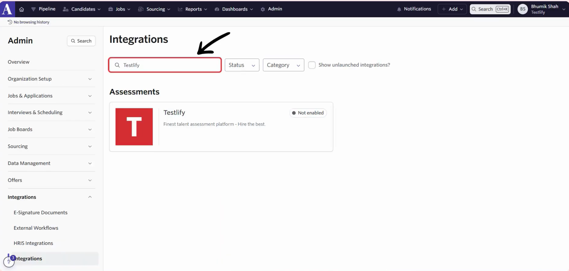 Click on Admin, then go to Integrations under the Integrations tab. Then search for Testlify.