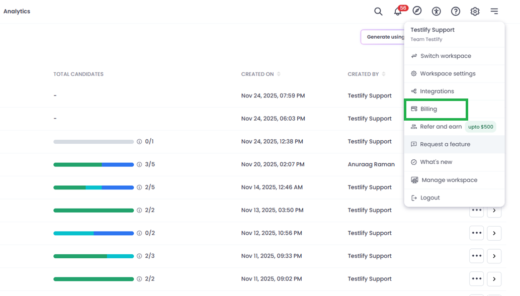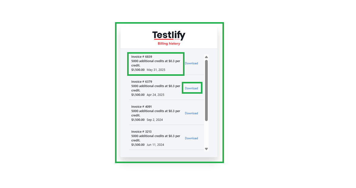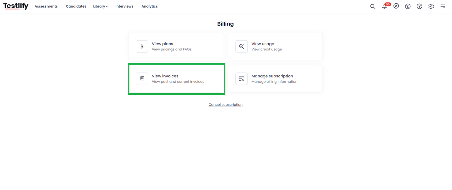 Whether you need invoices for accounting, finance, or record-keeping, Testlify provides a dedicated billing section where you can easily access all past and current invoices.