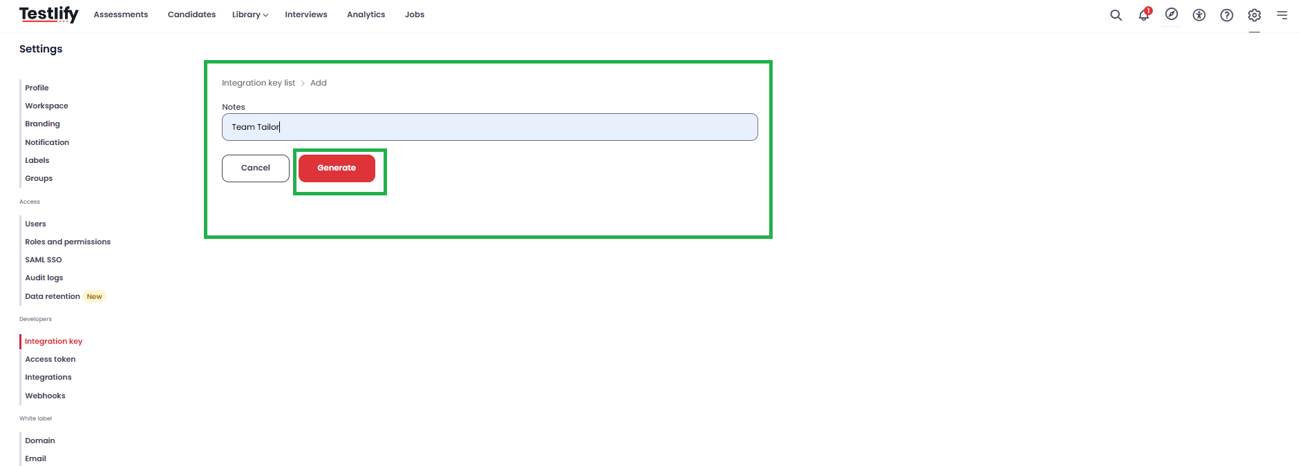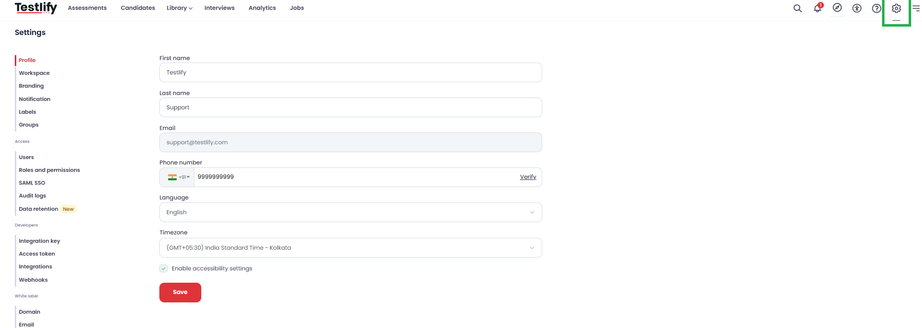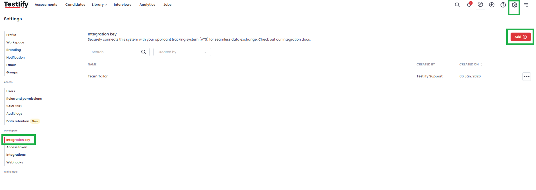 - Navigate to Testlify Workspace and click on settings icon.