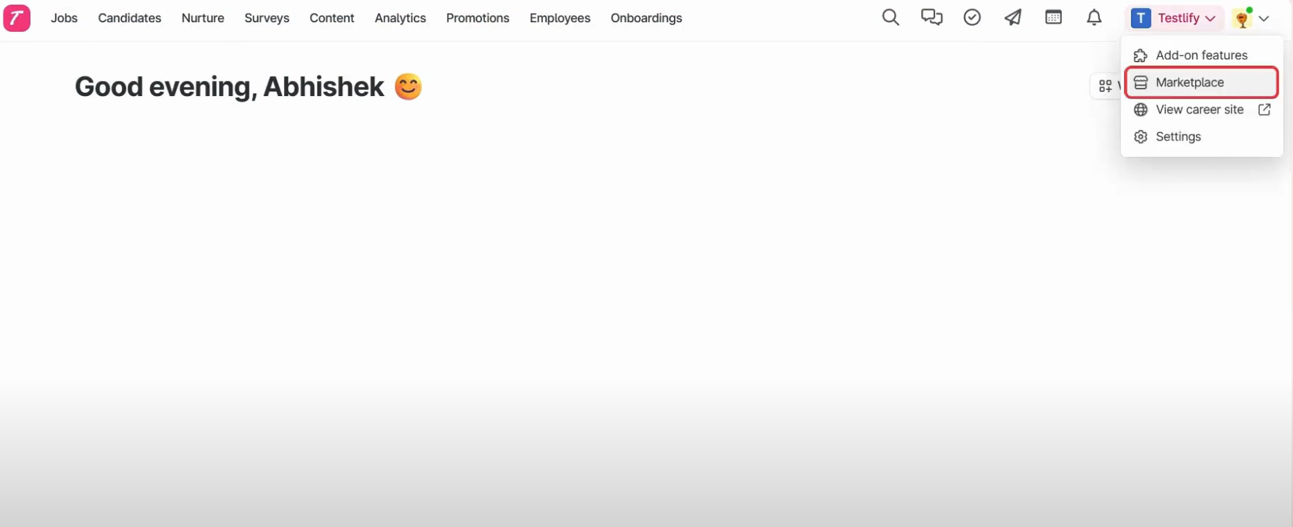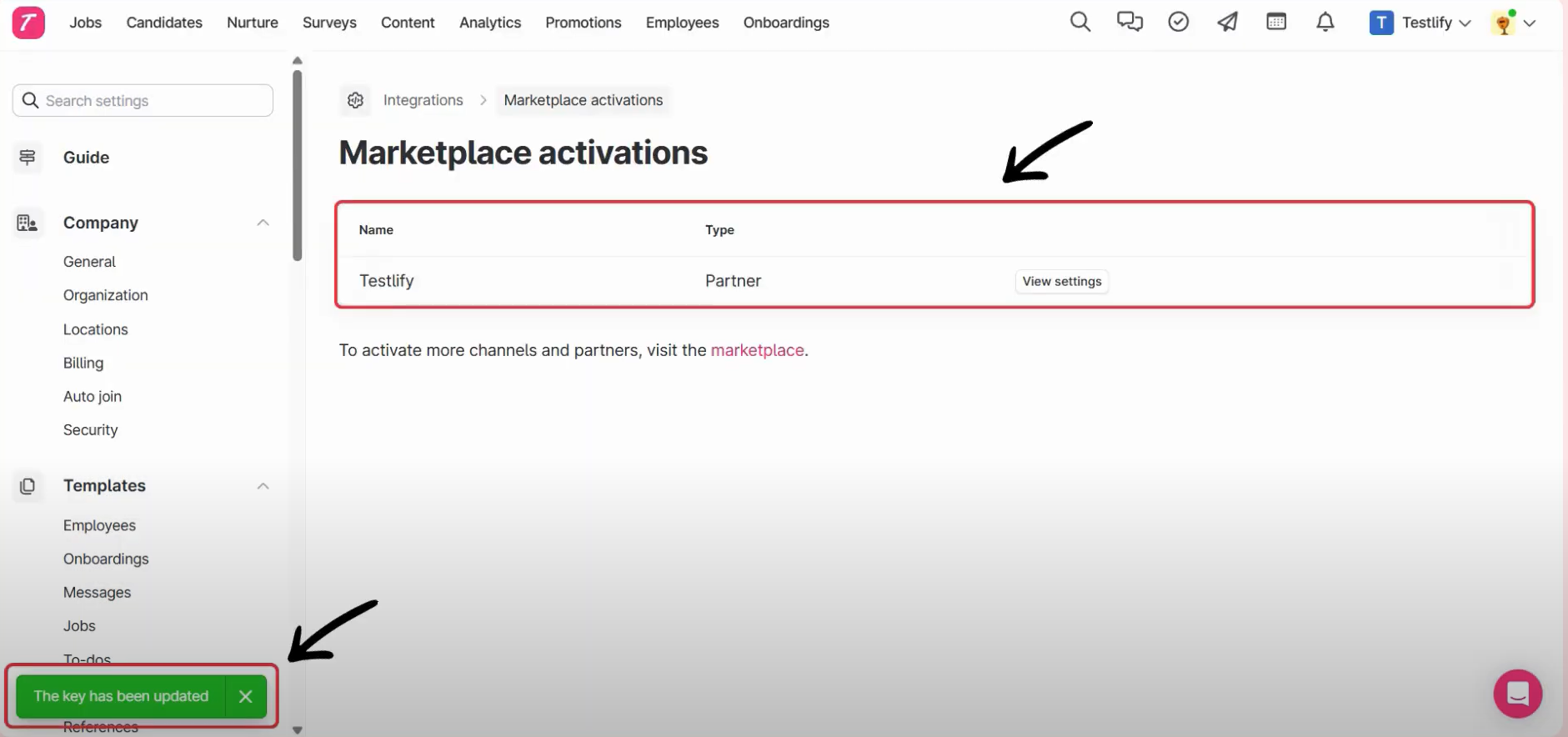 - Navigate to your Teamtailor Account. Click on your Company Name and select Marketplace.