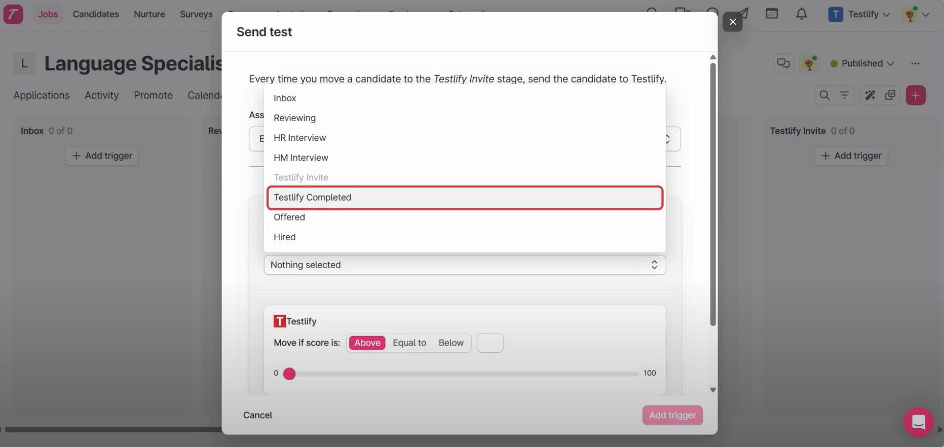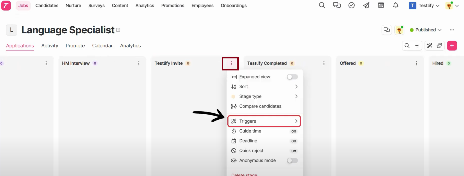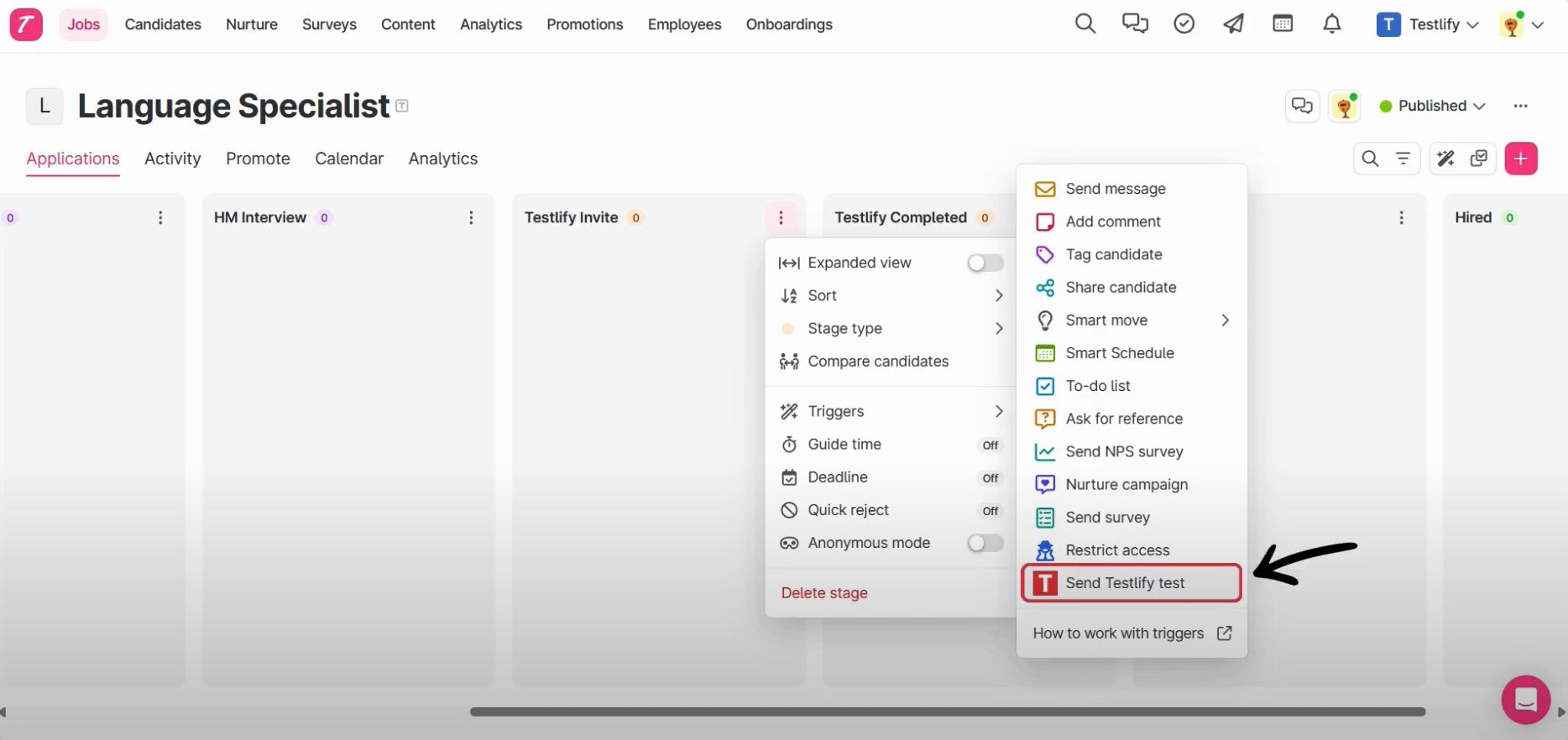- Add Teslify’s Assessment as a trigger on the desired stage. We are using the Testlify Invite stage to create Trigger. Any candidate moved to this stage will receive an assessment via Testlify.