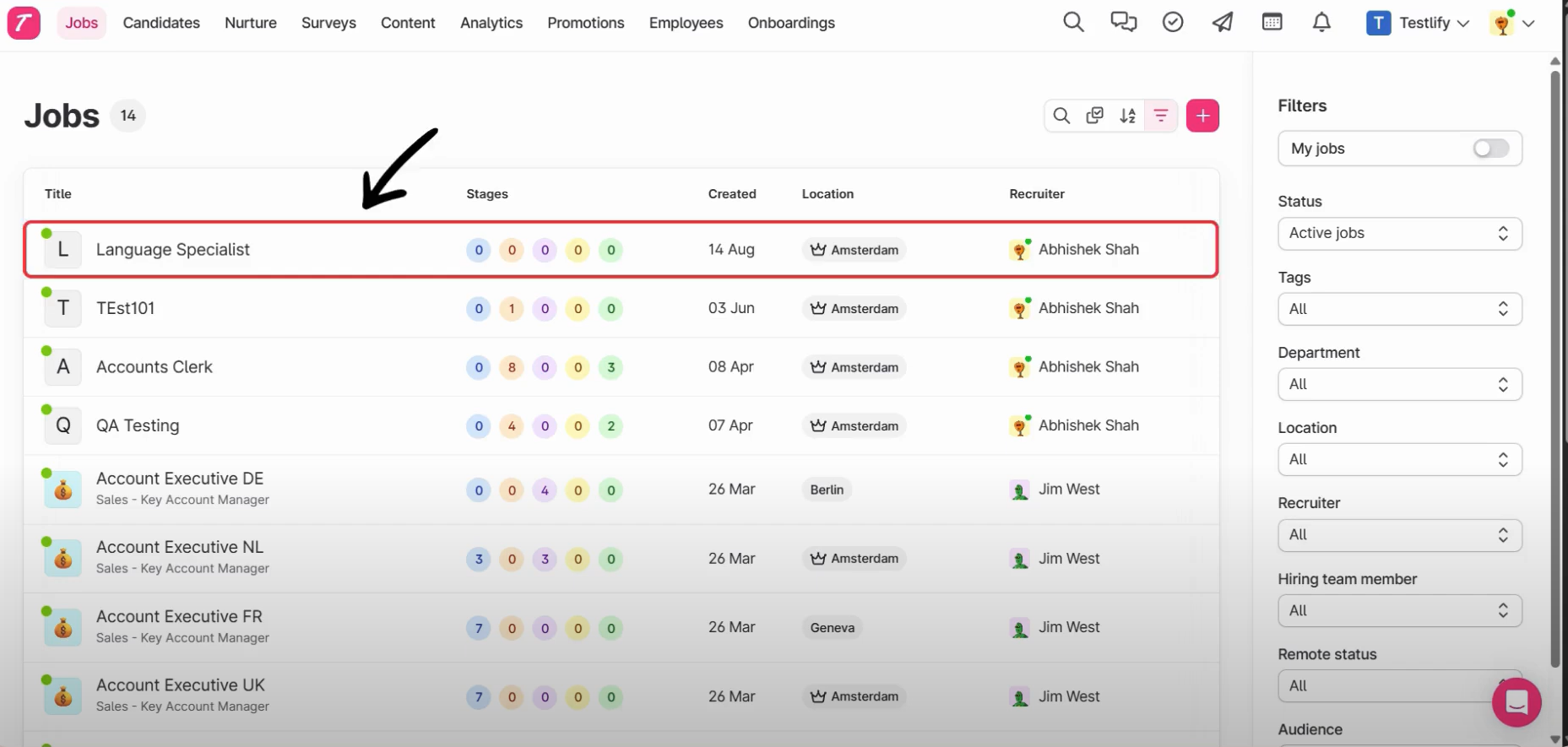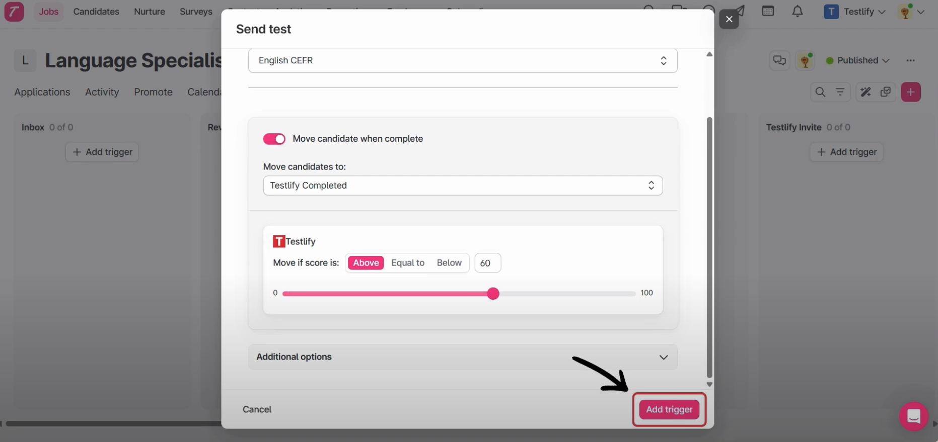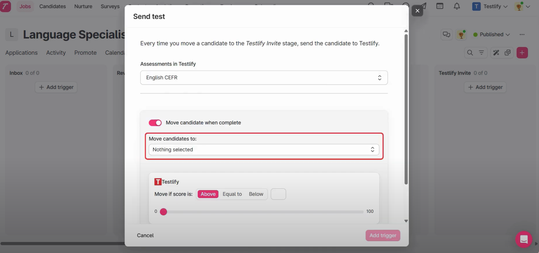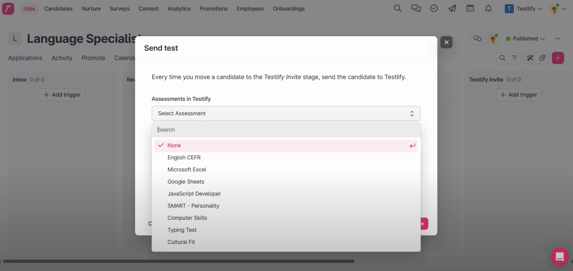 - Add Teslify’s Assessment as a trigger on the desired stage. We are using the Testlify Invite stage to create Trigger. Any candidate moved to this stage will receive an assessment via Testlify.