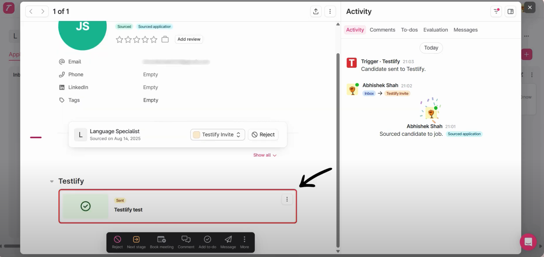 - Move a candidate to the Testlify Invite stage to trigger the assessment. The status will be shown as Sent once the candidate has been invited for the assessment via Testlify.