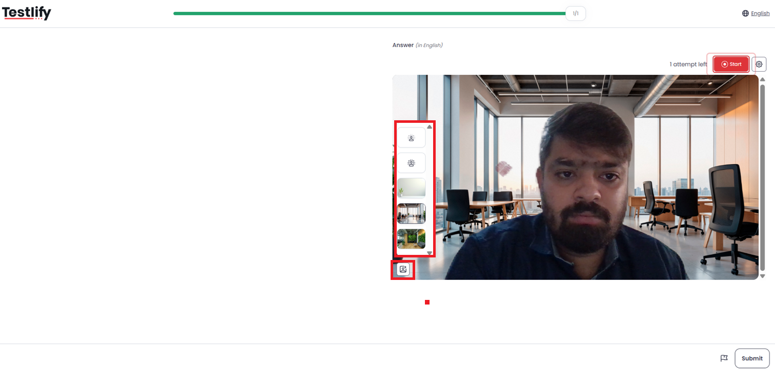 Testlify allows candidates to personalize their video recordings by applying a background of their choice. This feature can be used for both standard video questions and AI video questions, helping you create a professional or visually appealing recording environment.