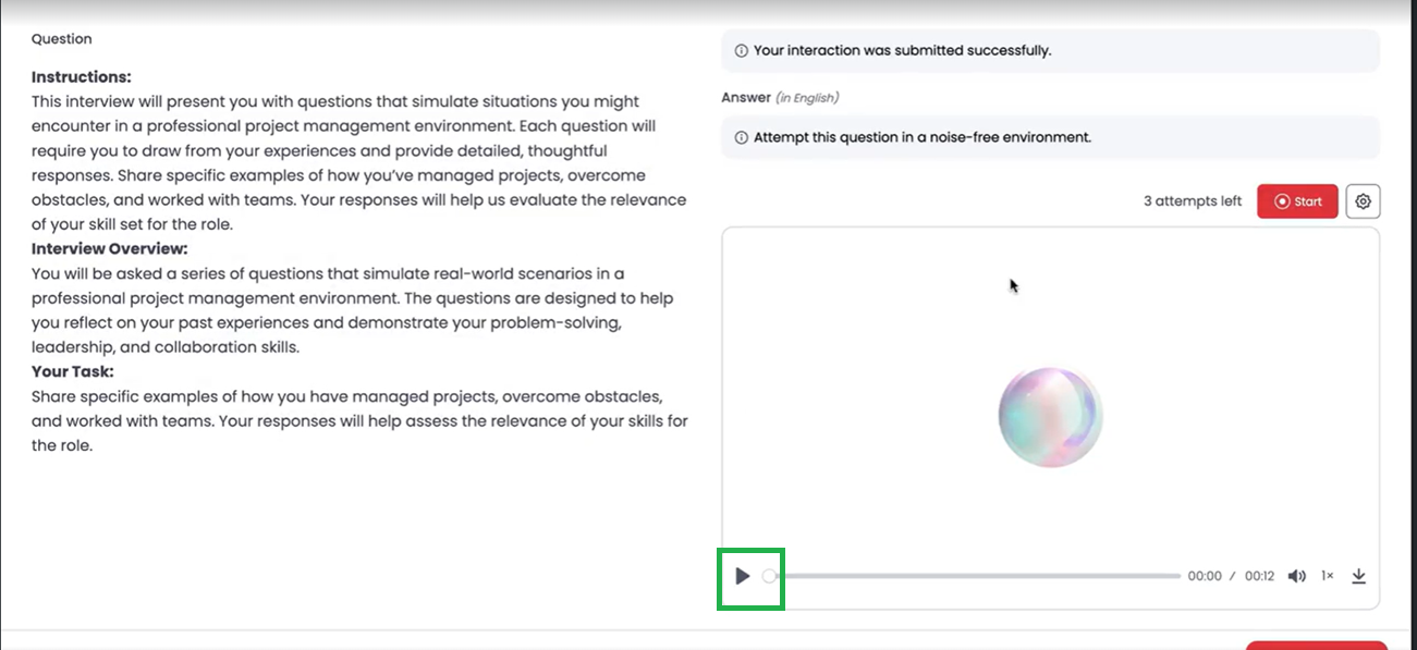 When completing an AI interview on Testlify, you have the option to preview your recorded response before final submission. This allows you to make sure your video and audio have been captured correctly, and that your response is exactly how you want it to be.