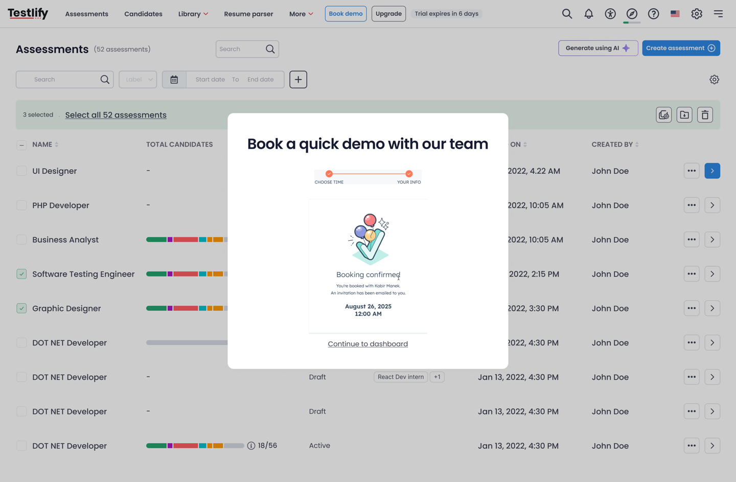 When you first sign up and enter your Testlify workspace, you’ll now see a demo call booking page. This feature allows you to instantly connect with our team and schedule a personalized walkthrough of the platform.