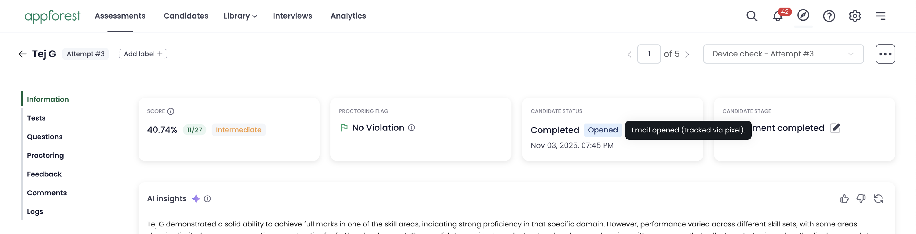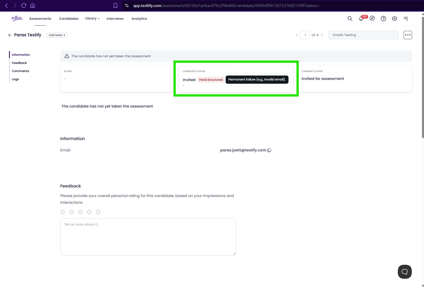 Testlify now displays the email delivery status directly on the Candidate Details Page (CDP) and Assessment Details Page (ADP).