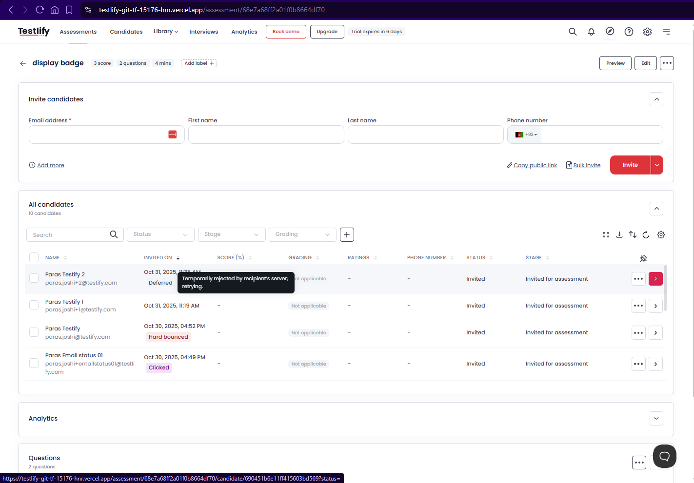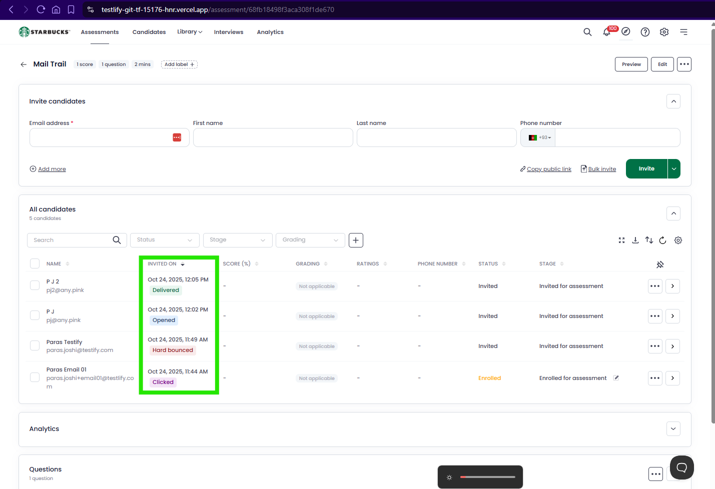 This feature gives you complete visibility into whether your test invitation emails were successfully delivered, opened, or bounced.