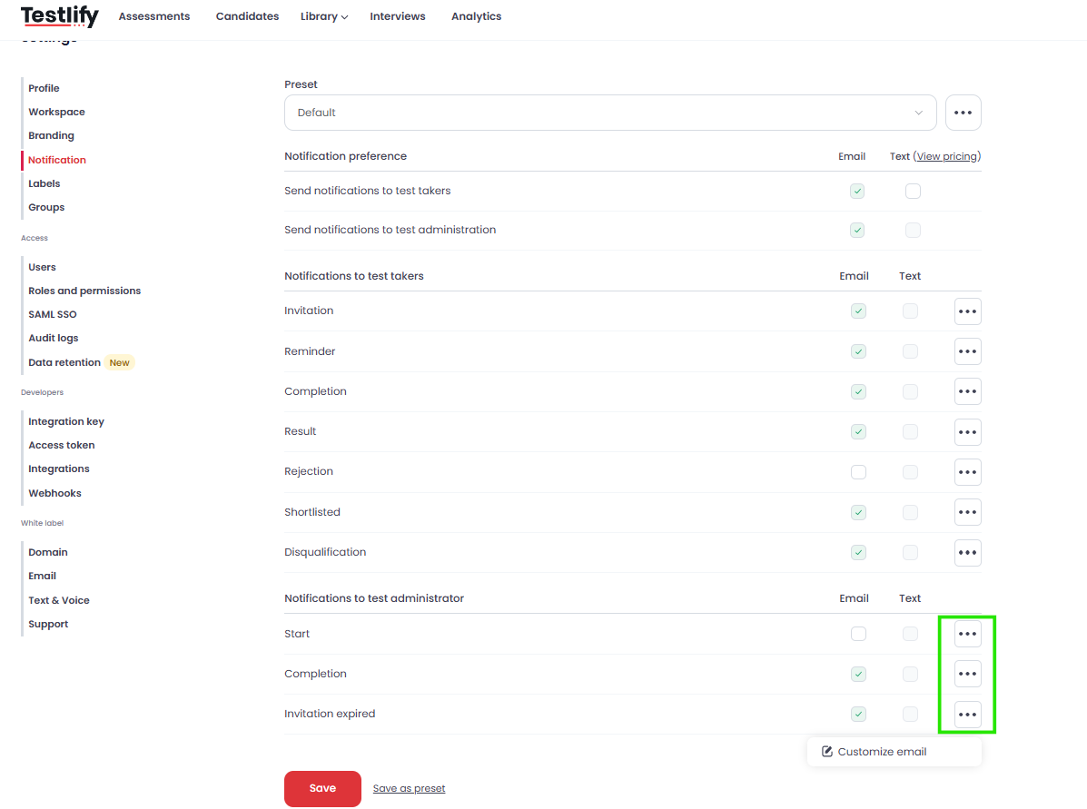 Testlify provides a range of notification options that keep administrators informed throughout every stage of the assessment process. This guide explains where to find these notifications, what each option means, and how to customize the email templates sent to your team.