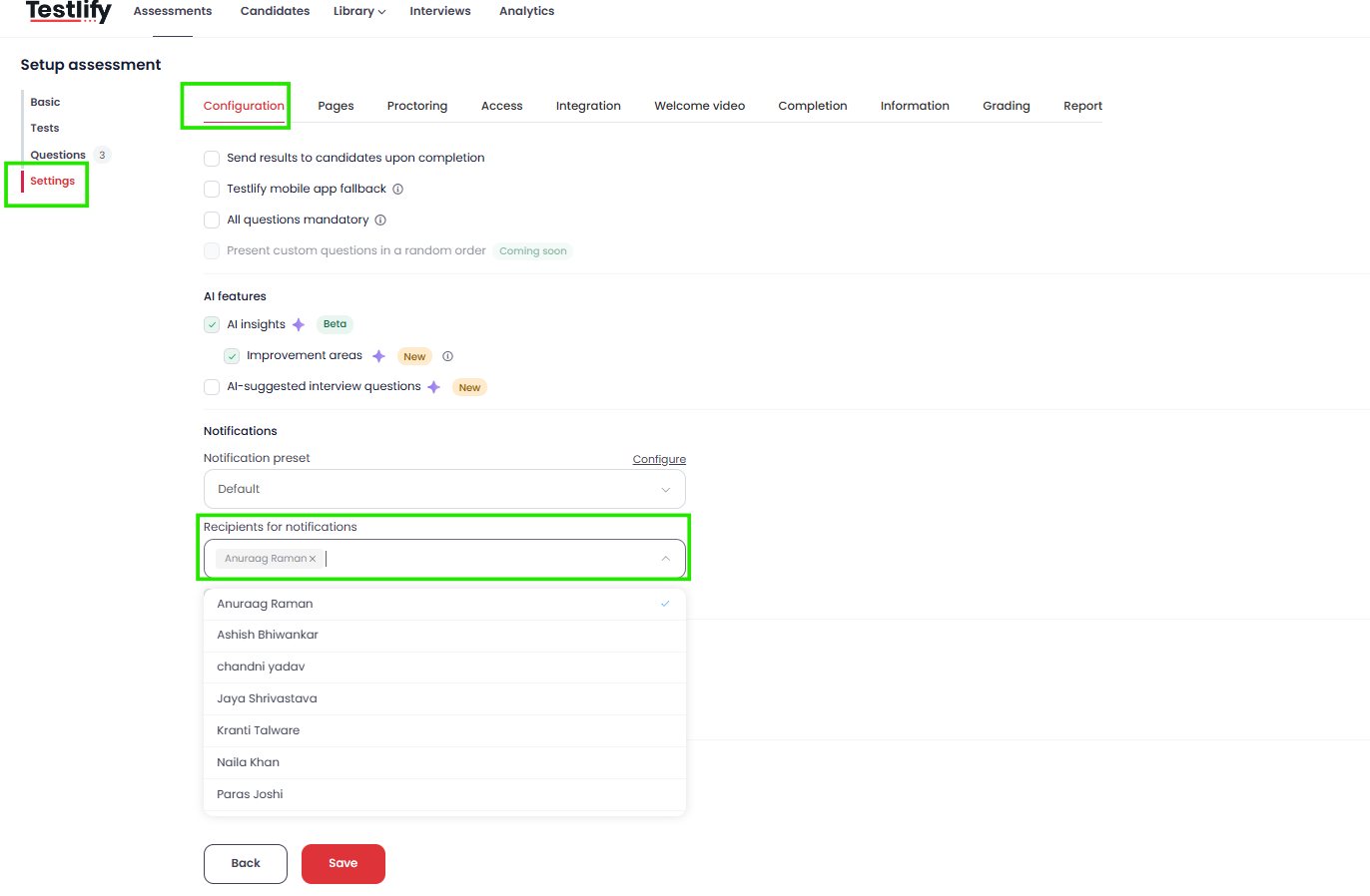With the new "Recipients for Notifications" feature, Testlify ensures recruiters can stay updated on assessment progress without the hassle of manually managing notification recipients. This update streamlines communication, reduces errors, and enhances the efficiency of the recruitment process.