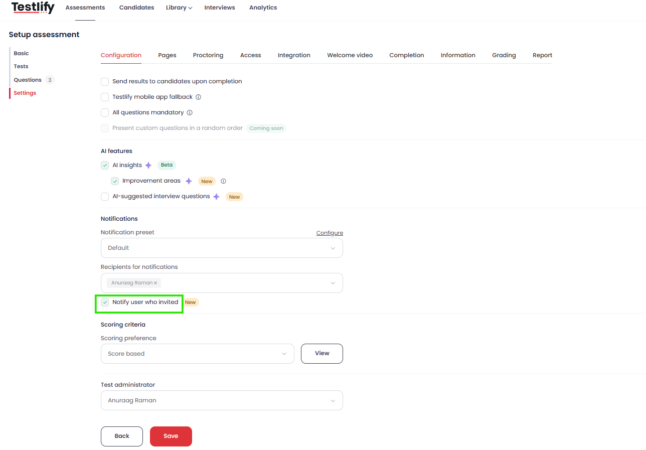 A checkbox labeled "Notify user who invited" has been added to the notifications section. By enabling this checkbox, you automatically ensure that the inviter will be notified about assessment activities tied to their invitation.