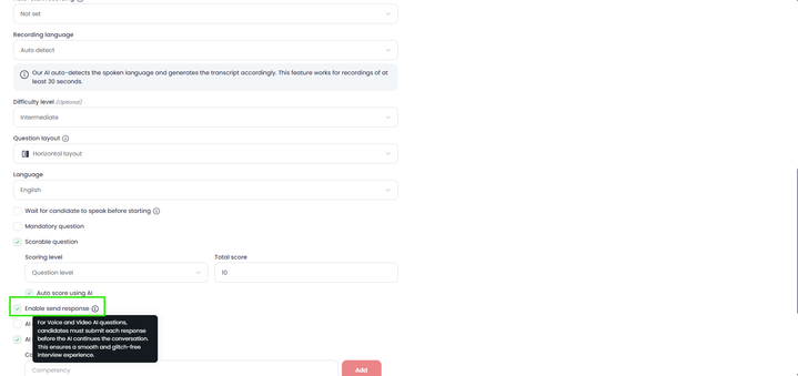 In the question setup page, you’ll now see an Enable send response option. When activated, the candidate, not the AI, controls when their answer is submitted.