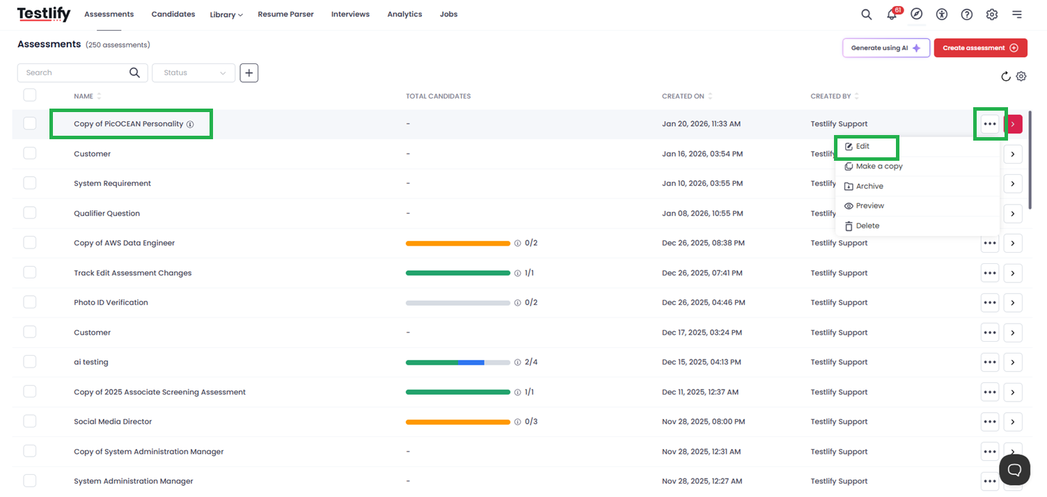 From your dashboard, choose the assessment for which you want to set country restrictions and click Edit.