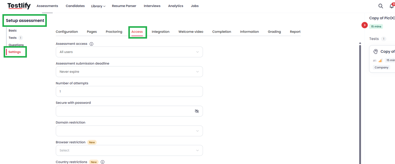 Inside the assessment editor, go to the Setup Assessment page, click on Settings in the left menu, and then select Access.