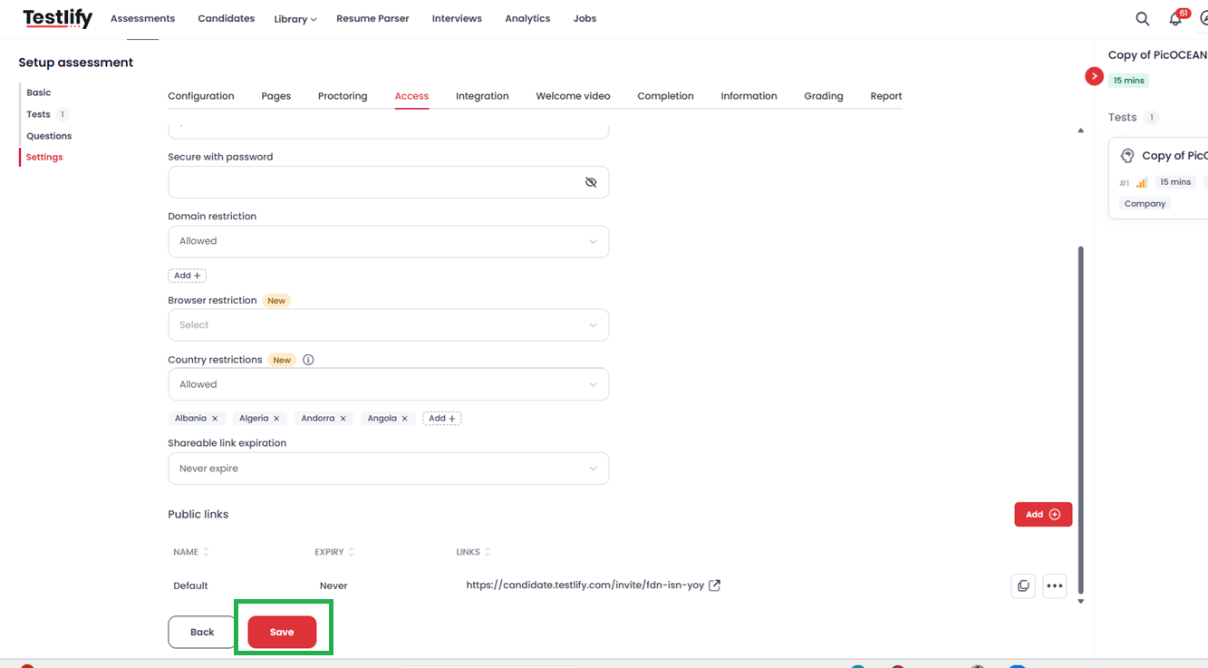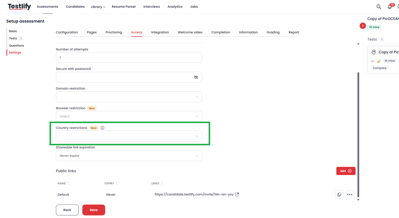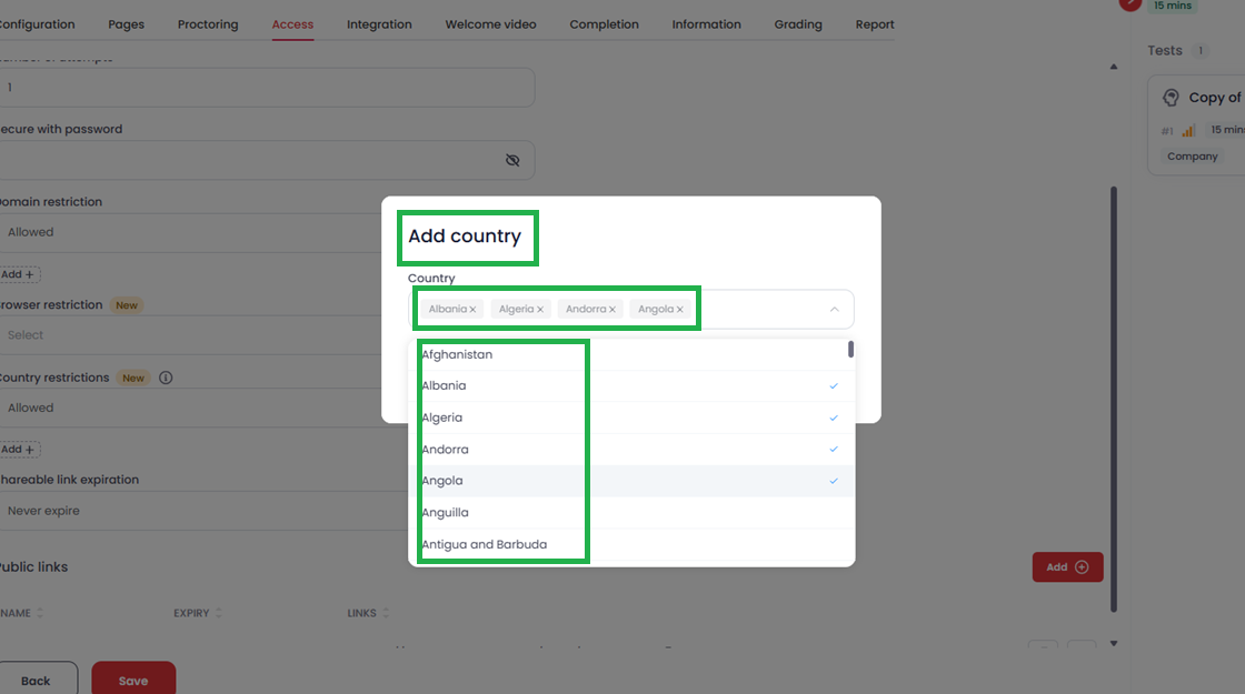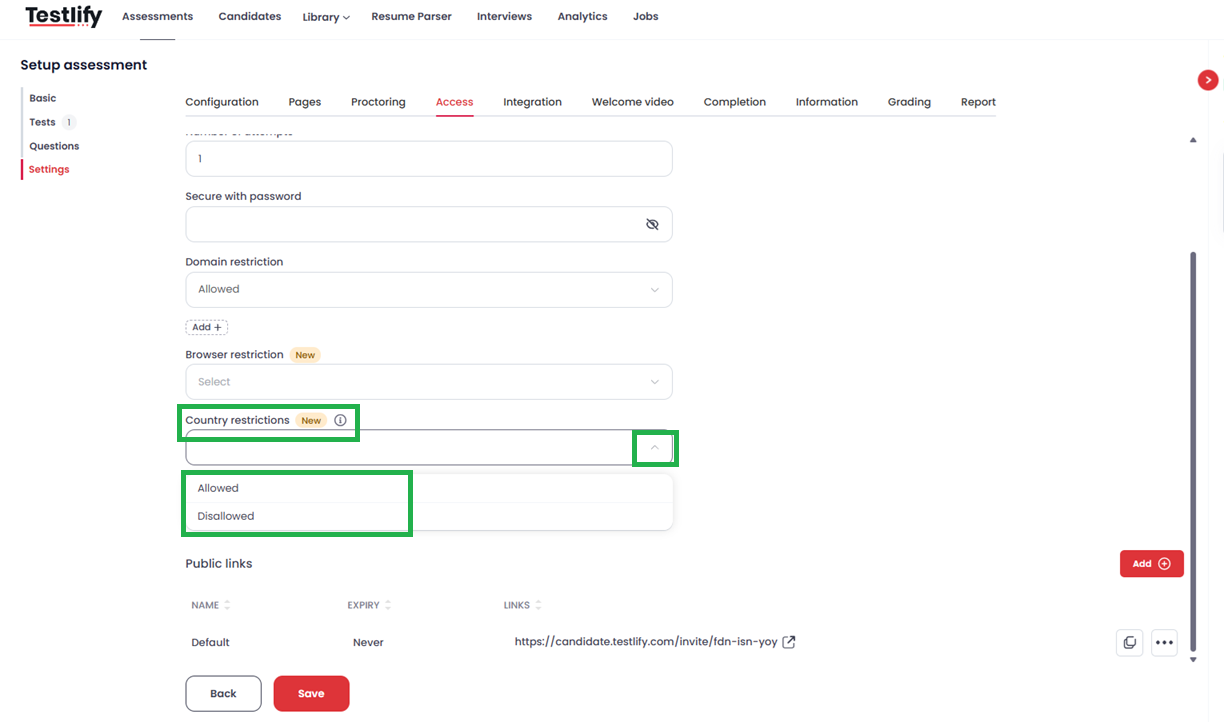 The Country Restriction feature provides a simple yet powerful way to control geographic access to your assessments. By choosing either "Allowed" or "Disallowed" mode and selecting the relevant countries, you can ensure that your assessments are only accessible to candidates in your preferred locations.