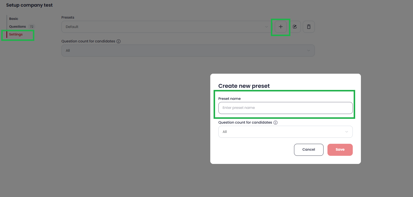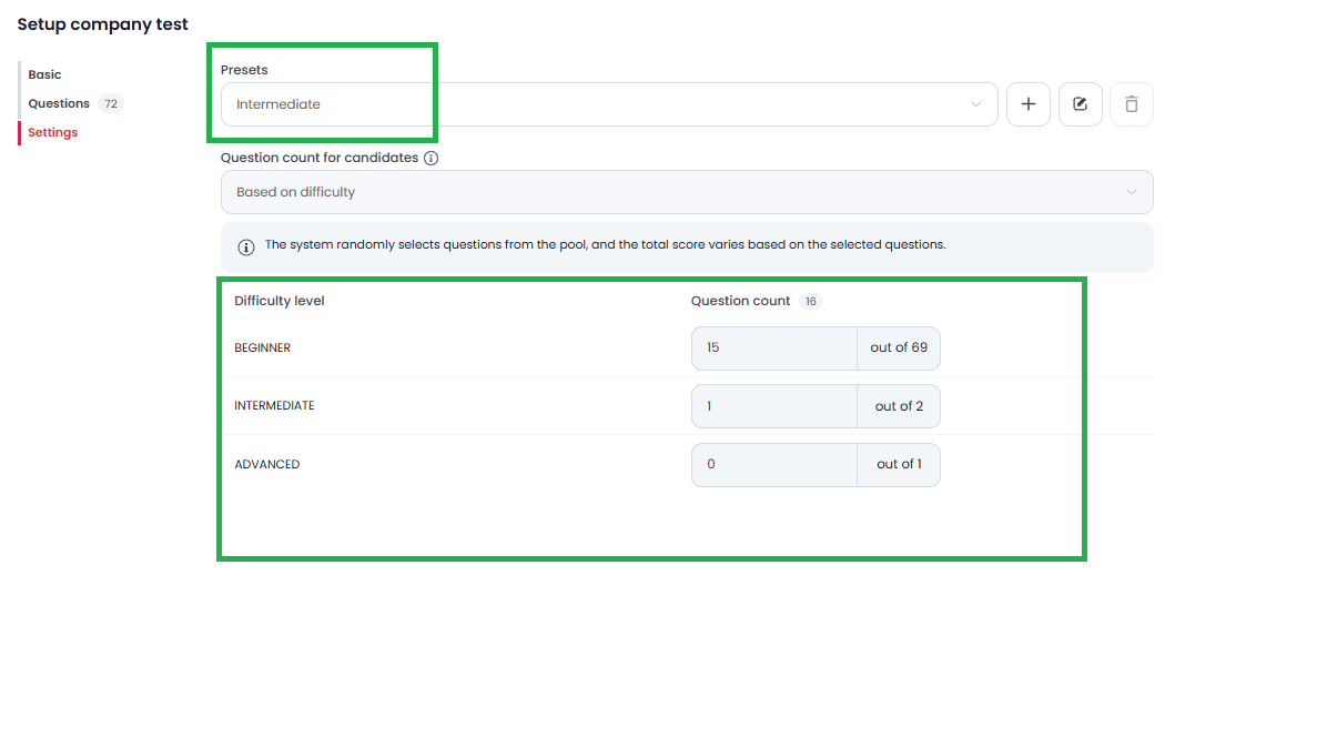 Presets allow you to define rules for selecting questions from a Company Test. Once created, a preset can be reused and applied to assessments to ensure candidates receive the intended set of questions.