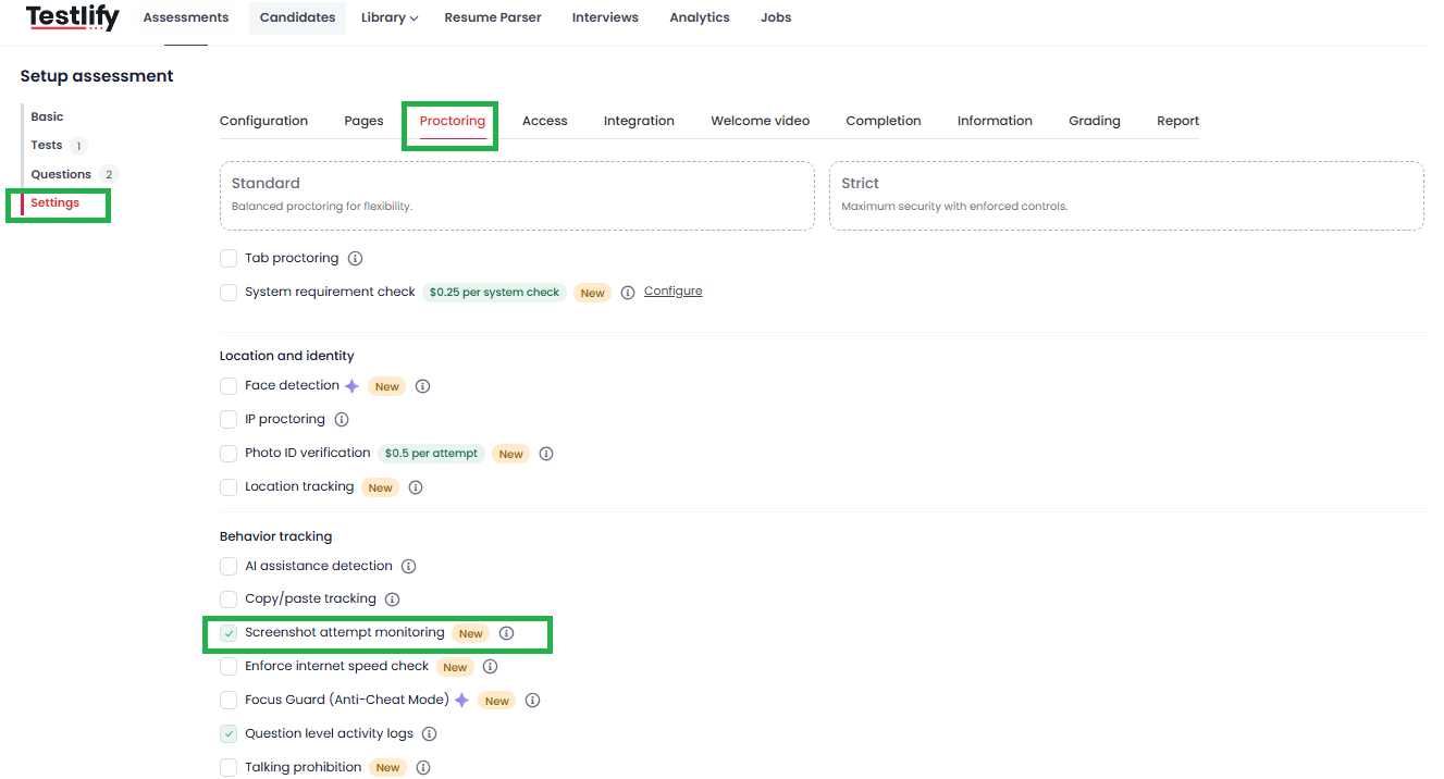 Screenshot Attempt Monitoring is a new proctoring feature available under Assessment Settings → Proctoring.