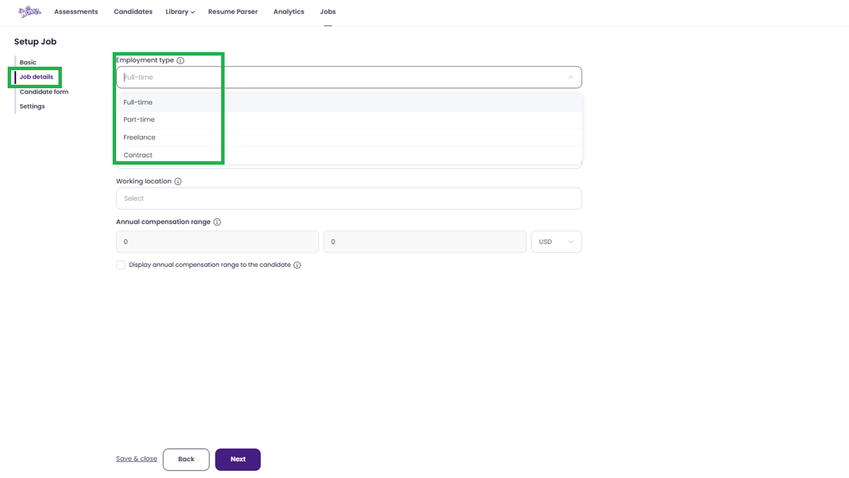 Employment Type: Choose between Full time, Part time, Freelance, or Contract.
