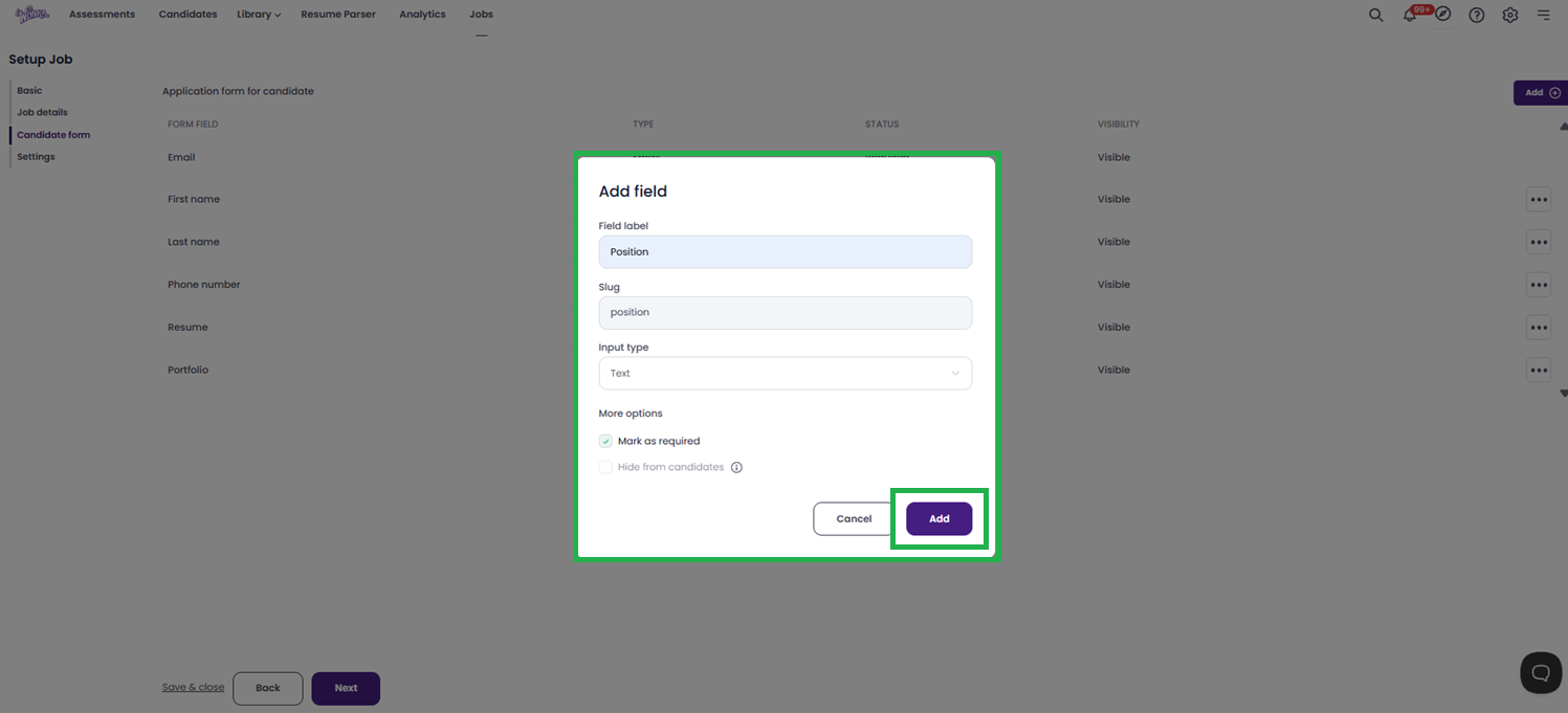 Choose whether to Hide from candidates (useful for internal tracking fields).