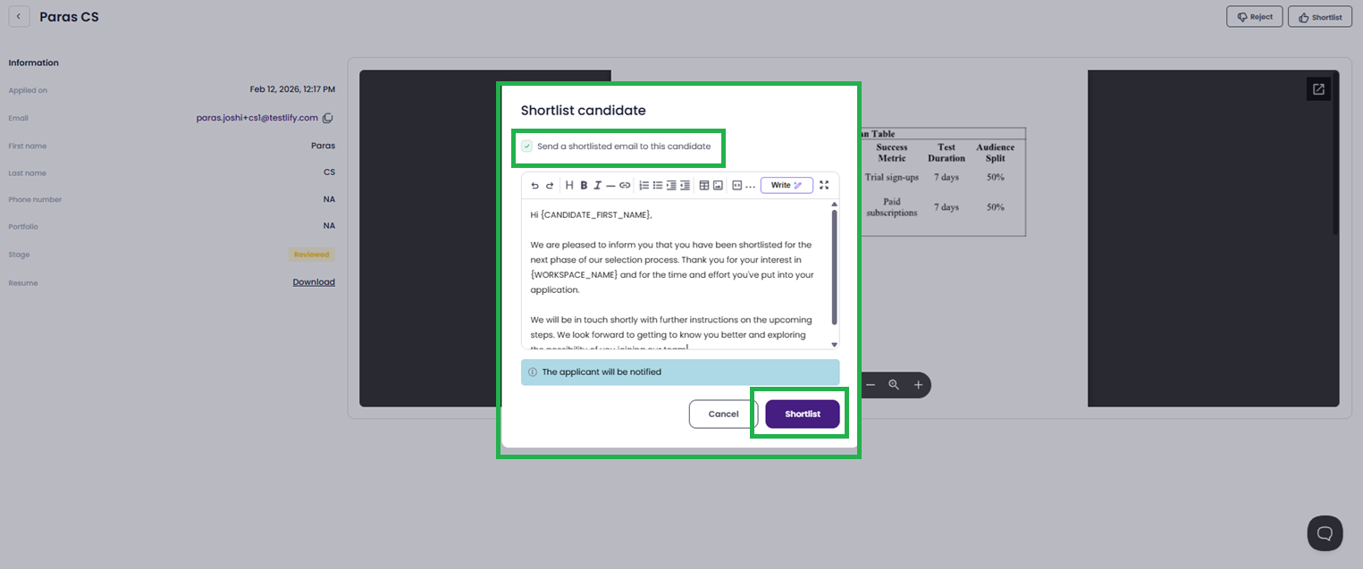 Shortlist: Clicking this will automatically send an email notification to the candidate informing them they have been shortlisted.