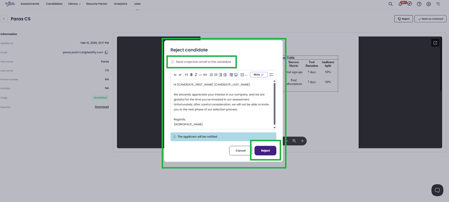 Reject: If you choose to reject, the system will ask if you want to send an email notification to the candidate. Confirm your choice to finalize the rejection.