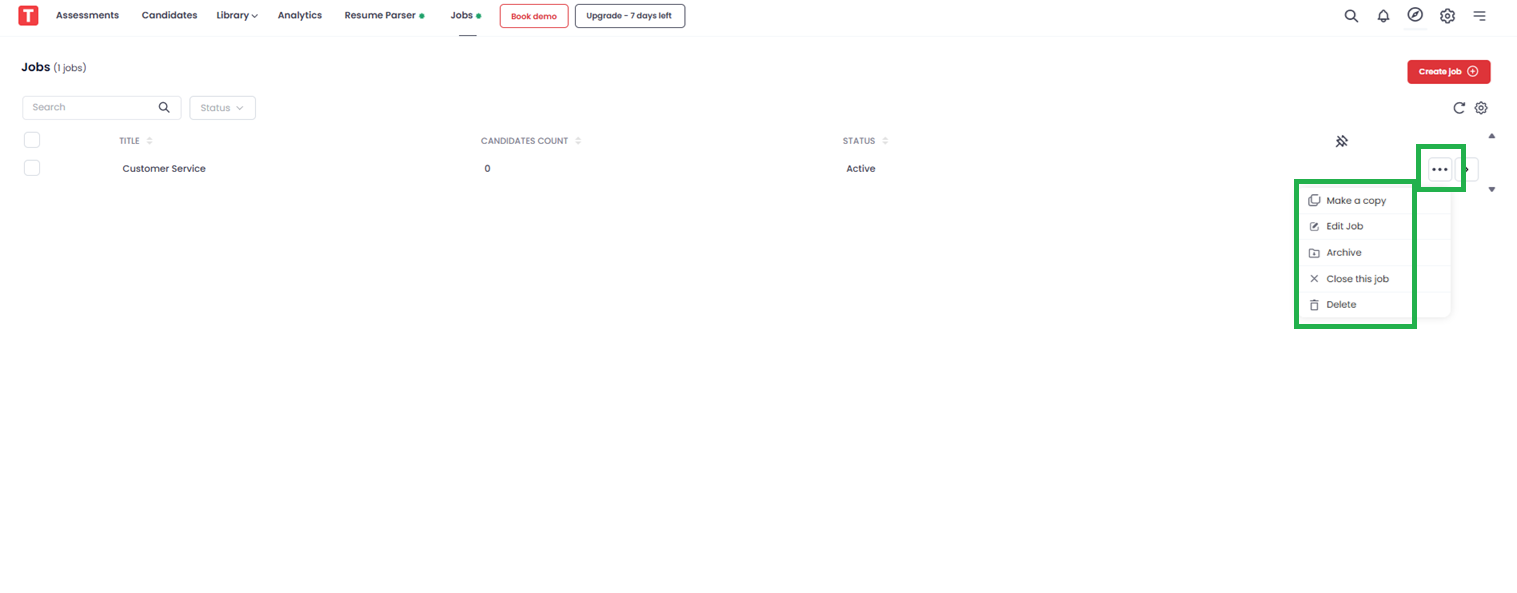 On the Jobs page, locate your published job and click the three dots (⋮) to access these options: