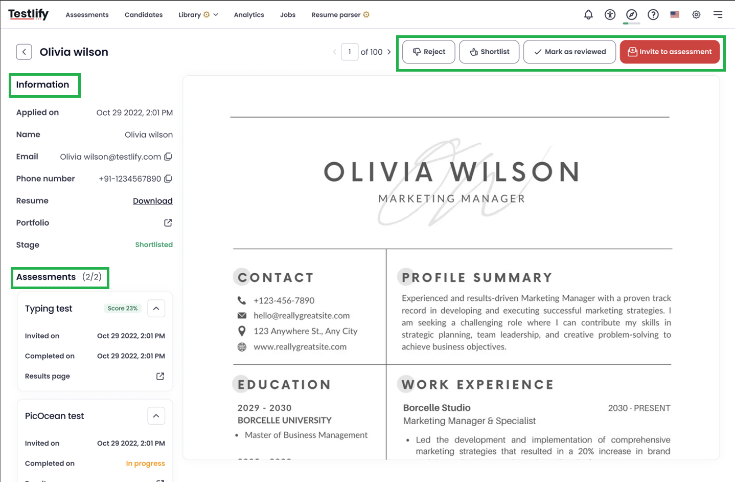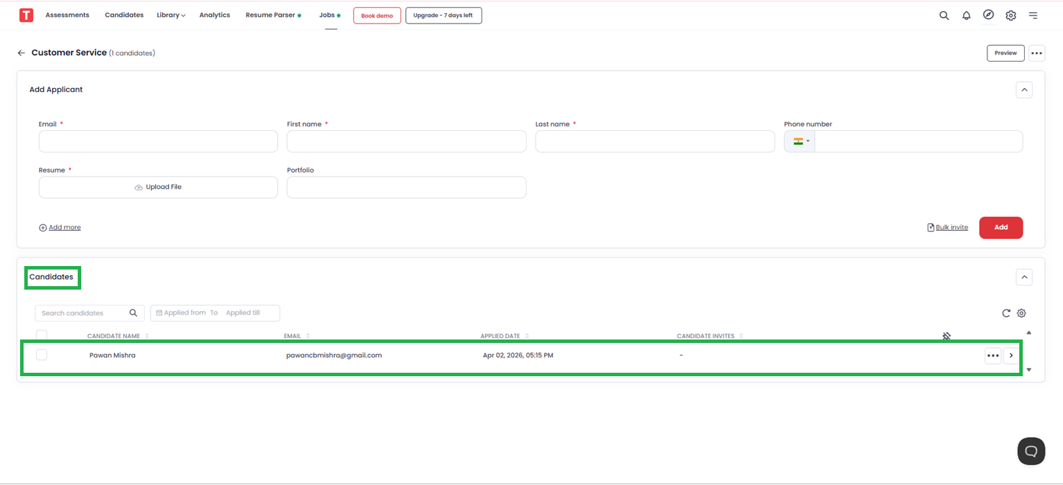 Go to the Candidates section to see all applicants and click on the candidate name to view more details.